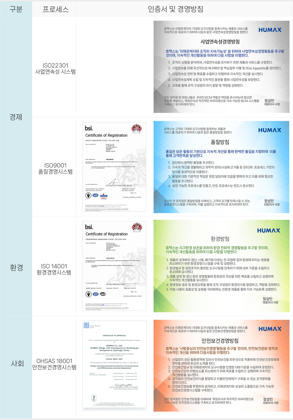 휴맥스는 급변하는 경영환경 속에 경제적 가치와 사회적 가치를 함께 추구하는 지속가능경영을 통해 지속적인 가치를 창출하는 영속기업으로 나아가겠습니다.