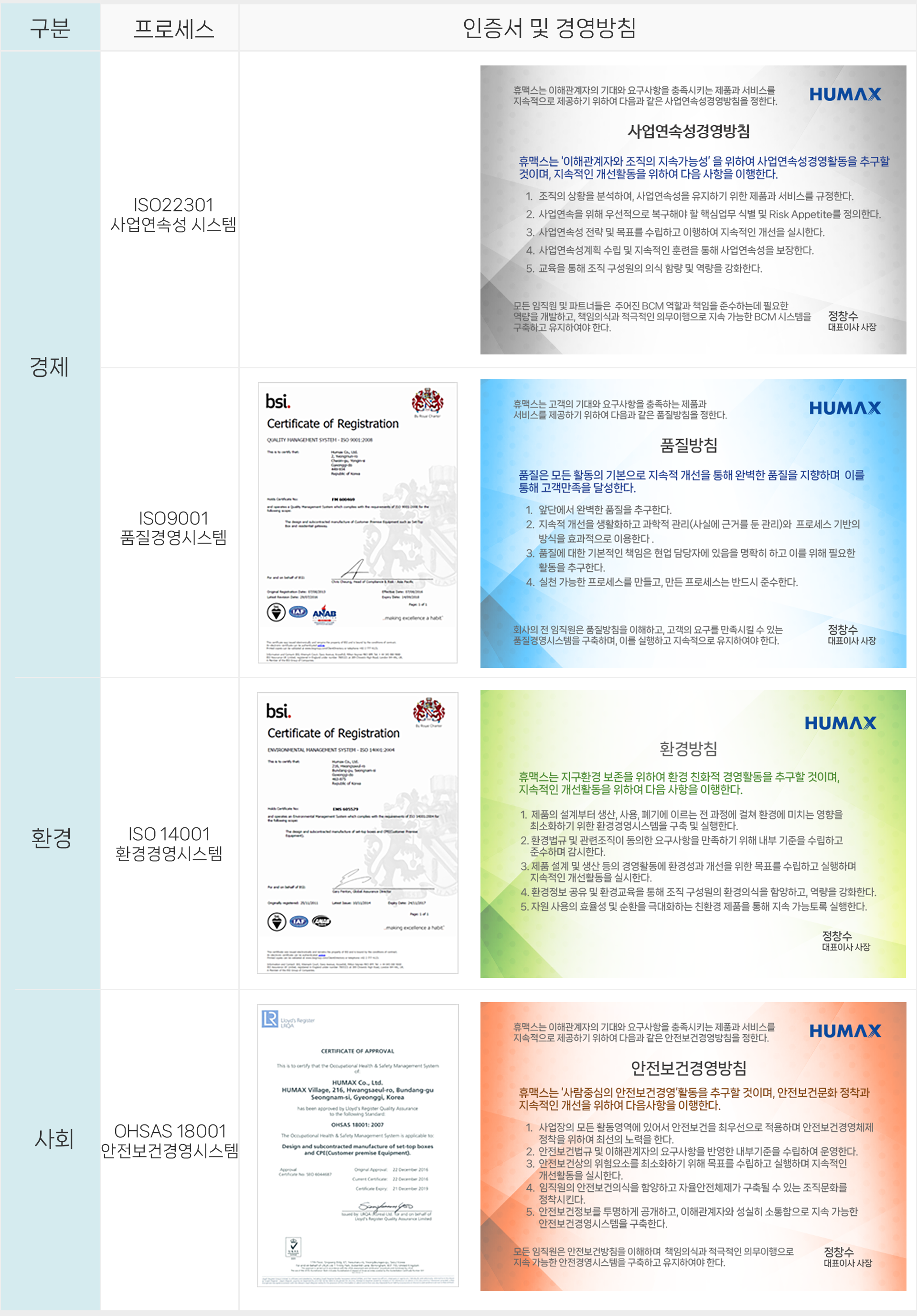 휴맥스는 급변하는 경영환경 속에 경제적 가치와 사회적 가치를 함께 추구하는 지속가능경영을 통해 지속적인 가치를 창출하는 영속기업으로 나아가겠습니다. 글로벌 1위 기업으로 한걸음씩 성장해 나가는 휴맥스의 여정을 관심 있게 지켜봐 주시기 바랍니다.