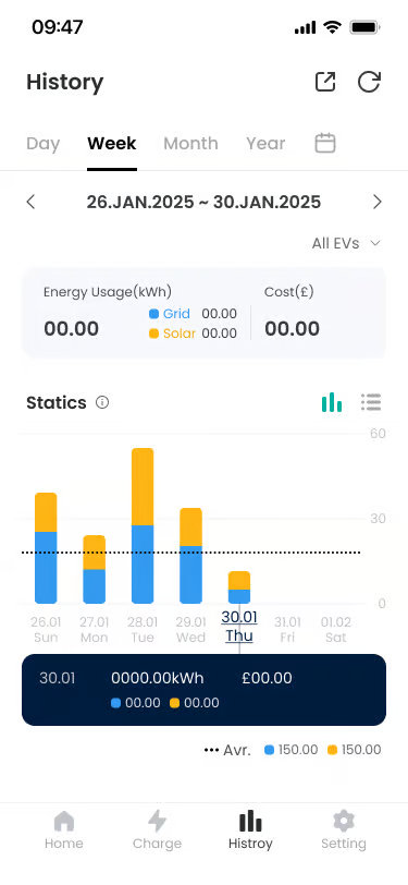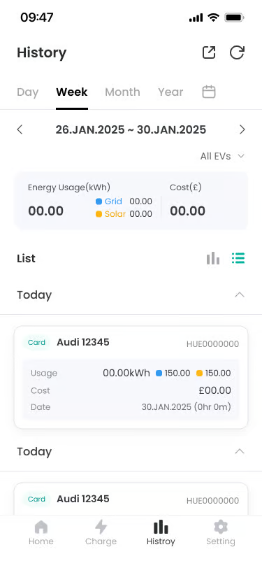 Functionality: Provides detailed history of individual charging sessions in list form. You can check charger name, date, time, charge amount (kWh), cost information, etc.