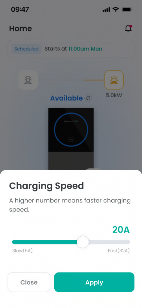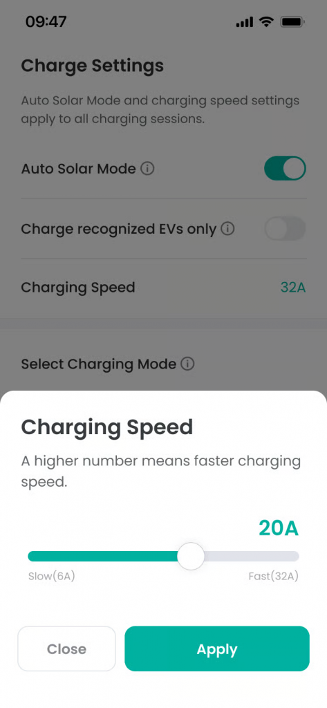 Notes: Default value is set to Max, and can be set between MIN (6A) ~ MAX (Charger maximum current). - Close Button