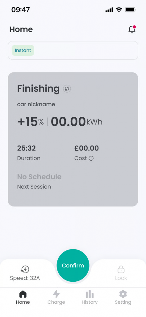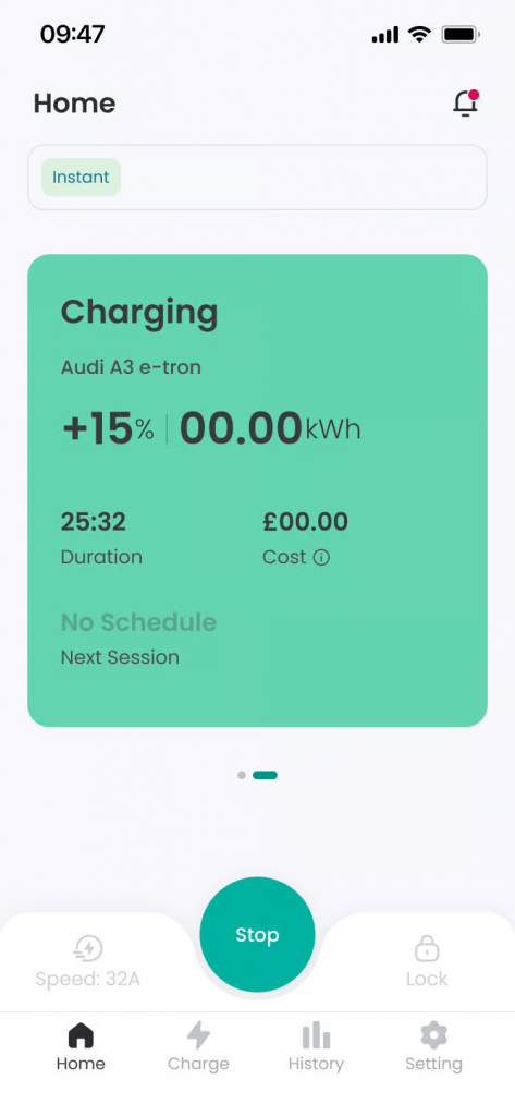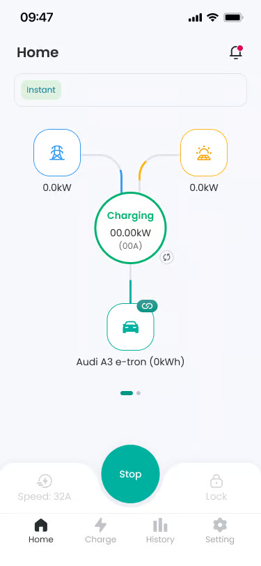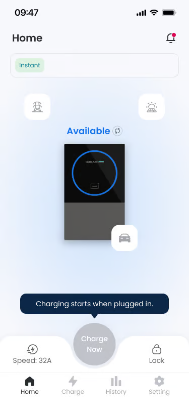 Functionality: Charging starts in earnest, and the screen status changes to ‘Charging’. You can check real-time power information supplied from Grid and Solar.