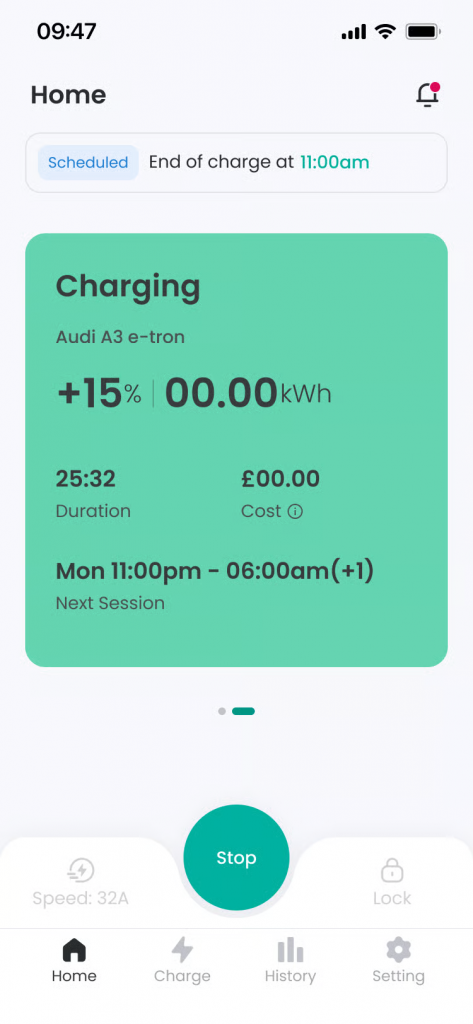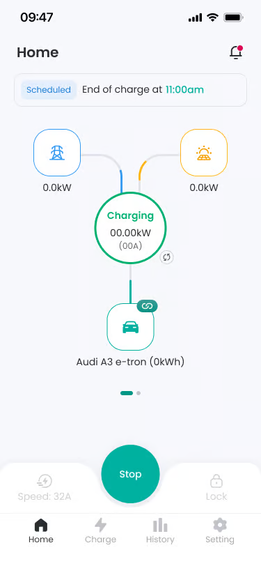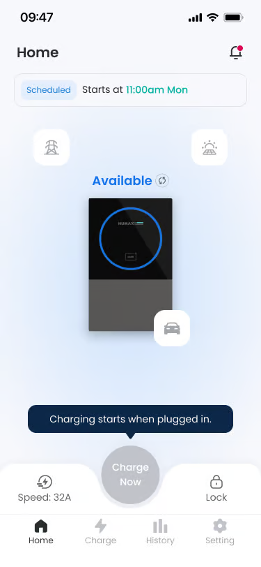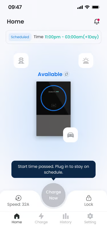Functionality: When the set schedule start time arrives, charging starts automatically, and screen status changes to Charging. You can check real-time power information supplied from Grid and Solar.