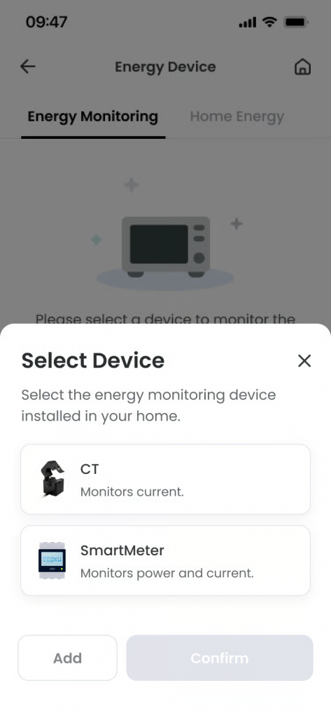 Functionality: Select the Energy Monitoring Device to use. You can select basic provided accessories (CT, Smart Meter, etc.) or add registerable devices.