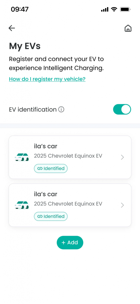 Functionality: Directly enter and register vehicle information. You must enter nickname, brand name, model name, and battery capacity (kWh), and battery capacity is used as reference data for intelligent charging.